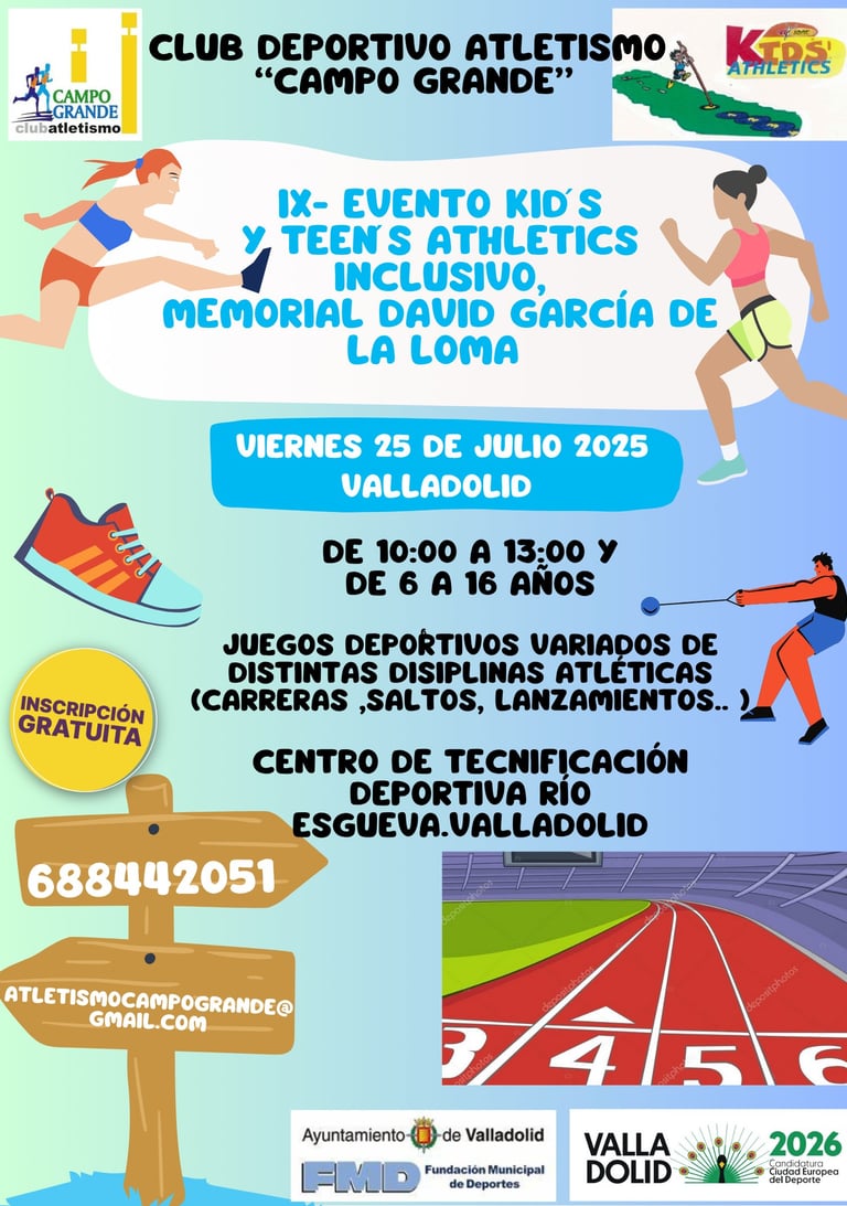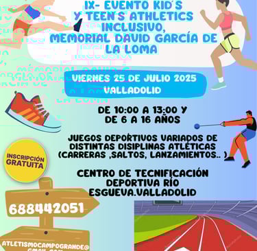 Nos llena de emoción anunciar que regresa el IX Evento Kid’s & Teen’s Athletics Inclusivo – Memorial David García de la Loma, organizado por el Club Deportivo Atletismo Campo Grande. La cita será el viernes 25 de julio de 2025, en el Centro de Tecnificación Deportiva Río Esgueva (Valladolid), de 10:00 a 13:00 horas.
